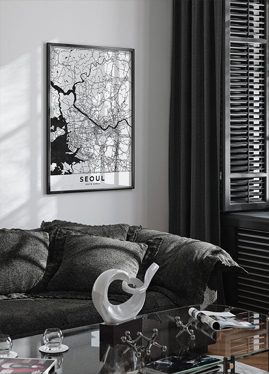 Seoul Poster van StudioSix legt de hartslag van de stad vast in een stijlvol, grafisch kaartmotief. De heldere lijnen en harmonieuze proporties benadrukken de structuren en het ritme van de metropool, van dichte wijken tot open stedelijke ruimtes. Een verfijnde eyecatcher die grootstedelijke sfeer en Koreaanse elegantie in het interieur brengt. Met een minimalistische expressie.