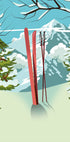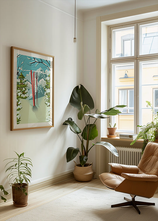 Een levendig, gestileerd wintertafereel van Nicholas: een skiër staat op een bergtop met uitzicht op besneeuwde toppen en donkere sparren, terwijl fijne sneeuwvlokken in de heldere, koude lucht vallen. Het motief straalt avontuur en klassieke alpine reispostersfeer uit – energiek, nostalgisch en vol beweging. Perfect voor wintersport en skiplezier.