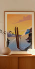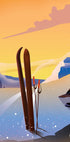 Ski Trip by Nicholas legt de rust vast vóór de avondwandeling: besneeuwde bergsilhouetten worden weerspiegeld in een rustig meer, terwijl skisporen en rechtopstaande stokken avontuur suggereren. Het verloop van de lucht van warm oranje naar diep paars werpt een dromerige gloed over het landschap en nodigt uit tot winters escapisme. Perfect voor dromers, reislust en alpine zielen.