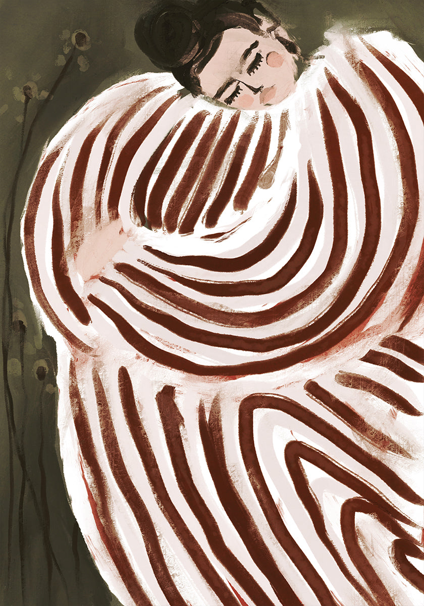De bovenstaande prinsesposter legt de stille schoonheid vast in een vredige slaap, gehuld in een vloeiende jurk versierd met vegende, organische strepen in aardse rode en zachte witte tinten. De dromerige, illustratieve stijl straalt warmte, comfort en een zachte elegantie uit, waardoor het een perfect statement is voor slaapkamers, leeshoeken of gezellige woonruimtes. Het rustgevende kleurenpalet en de zachte penseelstreken creëren een ontspannen sfeer, terwijl de expressieve lijnen een vleugje artistieke verfijning toevoegen. Ideaal voor galerijmuren of als op zichzelf staand kunstwerk voor wie zowel charme als rust waardeert in zijn interieur.