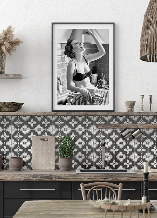 Een speelse en gewaagde zwart-witfoto van een vrouw die geniet van spaghetti in een vintage geïnspireerde keuken. Met een ontspannen houding straalt ze zelfvertrouwen en humor uit, waardoor dit kunstwerk een stijlvolle en leuke toevoeging is aan moderne interieurs. Perfect voor keukendecoratie, fijnproevers en fotografieliefhebbers.