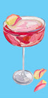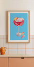 Dit levendige kunstwerk toont een gestileerde cocktail in een glas, versierd met roze en gele bloemblaadjes, tegen een helderblauwe achtergrond. De vloeiende penseelstreken van het schilderij creëren een moderne en energieke expressie, perfect voor thema's die verband houden met drankjes of hedendaagse kunst.