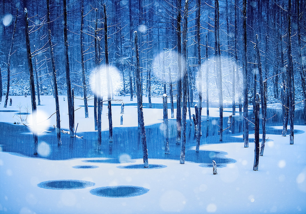Fairyland van Hidenori Sono legt een dromerig winterlandschap vast in koele blauwe tinten: een bevroren meer omringd door stille bomen, waar sneeuwvlokken vallen en een sprookjesachtige gloed creëren. De mist ligt laag over het water en de rustige weerspiegeling nodigt uit tot onderdompeling in de stille poëzie van de natuur. Een rustige ontsnapping naar het blauwe avontuur van de winter.