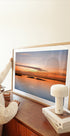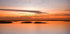 Een verbluffende foto met lange sluitertijd van een zonsondergang boven stilstaand water, met een zijdezacht oppervlak dat gloeit in oranje en roze tinten. Een zwerm vogels in een elegante vlucht maakt het tafereel compleet en voegt beweging en diepte toe aan dit rustige zeegezicht. Perfect voor liefhebbers van rustige, poëtische landschappen.