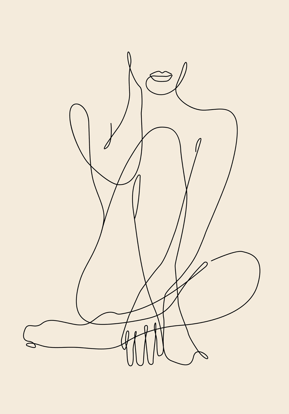 Een elegante en artistieke eenlijnstekening van een zittende vrouw, die vrouwelijke schoonheid en minimalistische stijl uitstraalt. De eenvoudige maar expressieve lijnen creëren een moderne en verfijnde look, perfect voor een modern en Scandinavisch interieur.