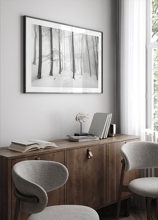 In mist en vorst ontvouwt zich een verstild winterlandschap, waar slanke beukenstammen als grafische lijnen in een ingetogen, besneeuwde bosruimte staan. Het licht wordt zacht door de nevel gefilterd en creëert een meditatieve blikvanger die de rust tussen de bomen vangt. Een poëtische natuurfoto van Tom Pavlasek. Perfect voor een winterse sfeer in huis.