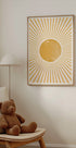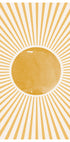 Dit kunstwerk heeft een minimalistisch sunburst-ontwerp met een centrale cirkel die rechte lijnen uitstraalt en een gewaagd geometrisch patroon creëert. Het gebruik van warme kleuren geeft een retro, vintage gevoel, perfect voor een moderne inrichting en artistieke expressie.