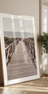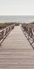 Een serene kustfoto van een houten promenade die rechtstreeks naar de glinsterende zee leidt. Het verdwijnpuntperspectief nodigt de kijker uit om naar de horizon te lopen en roept gevoelens van kalmte, vrijheid en de stilte van de zomer op.