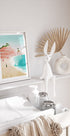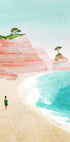 Een vredige kustillustratie met een eenzame figuur die langs een zandstrand loopt met turquoise golven en rode rotsen op de achtergrond. Geïnspireerd door de kust van de Algarve in Portugal, legt dit kunstwerk de rust en harmonie van de zomer aan zee vast.