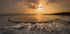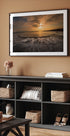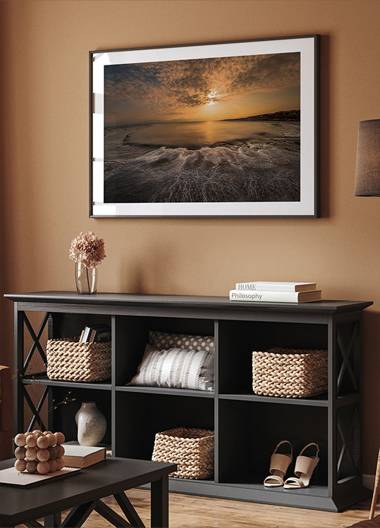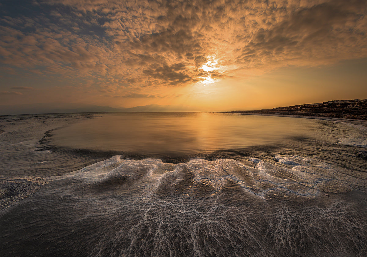 De structuur van zout van Isam Telhami laat het rustige ritme van de zee de ruimte vullen: zachte golven spoelen over het fijne, lichte zandstrand, waar het zout subtiele patronen langs de waterkant trekt. Over de horizon drijven zware wolken in gedempte blauw- en zandkleuren. Een rustig, minimalistisch motief dat uitnodigt tot contemplatie.