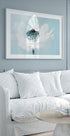 Een delicate macrofoto van een witte bloem met turkooiskleurige details die een dromerige en etherische sfeer creëren. De zachte focus en pastelkleuren roepen rust en elegantie op, waardoor het werk ideaal is voor interieurs die op zoek zijn naar harmonie en verfijnde schoonheid.