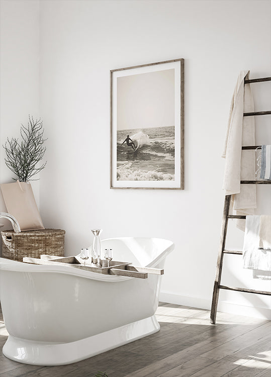 Een prachtige sepiakleurige foto van een surfer die met perfect evenwicht door de golven snijdt. De beweging van de zee en het dynamische waterspatten creëren een gevoel van avontuur en vrijheid. Ideaal voor surfers en een op de kust geïnspireerd interieurontwerp.