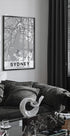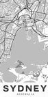 Een strakke, zwart-witkaart van Sydney, waar het stratennetwerk en de kronkelende kustlijn van de stad zich ontvouwen in scherpe lijnen en fijne details. Het silhouet van de haven en de karakteristieke wijken komen duidelijk naar voren, terwijl de subtiele textuur een discrete, vintage uitstraling geeft - perfect voor zowel modern als retro interieurontwerp in huis.