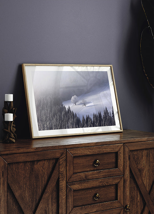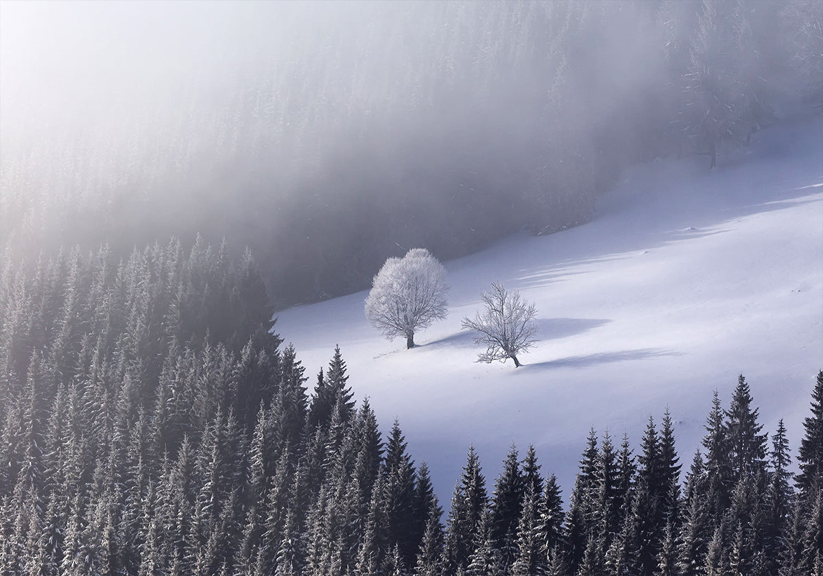 Et stille vinterlandskab udfolder sig i tåge og frost, hvor mørke graner står som tavse krigere langs en snedækket bjergskråning. Disen dæmper lyset og indkapsler en følelse af ro og isolation, mens konturerne af fjerne bjerge anes. Skabt af fotografen Lazar Ioan Ovidiu, inspireret af Rumæniens natur.