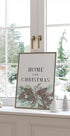Een sfeervolle kerstposter, waar sparren, dennenappels en rode winterbessen samenkomen in een elegant boeket, licht bestrooid met sneeuw. Gedempte tinten groen en wit creëren rust, terwijl de tekst "Home for Christmas" een warme, gastvrije toets toevoegt. Een eenvoudig, Scandinavisch eerbetoon aan de gezelligheid en traditie van de winter. Perfect om Kerstmis te verwelkomen.