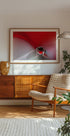 Een opvallend macro-abstract kunstwerk met een delicate waterdruppel tegen zachte rode en neutrale tinten. De close-up creëert een gevoel van intimiteit en elegantie, waardoor het een perfect statement-stuk is voor moderne interieurs.