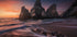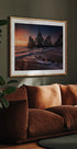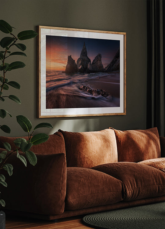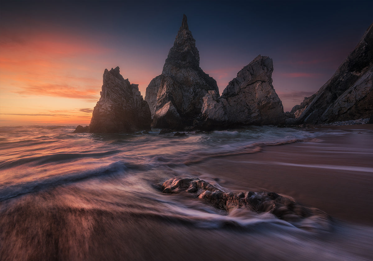 Praia da Ursa’s jagged sea stacks pierce the Atlantic as twilight softens the sky above Sintra’s wild coast. A long exposure turns the surf to silk, while warm sunset tones fade to deep blues, balancing drama and calm. This evocative seascape photograph is by artist Carlos F. Turienzo. Captured on Portugal’s rugged Atlantic coast near Lisbon.