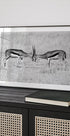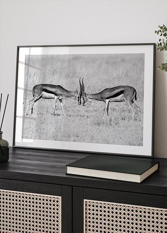 Een krachtige zwart-wit dierenfoto van twee gazellen die tegenover elkaar staan in een duel, waarbij hun hoorns botsen in kracht en uitdaging. Dit beeld, vastgelegd op de uitgestrekte Serengeti-savanne, brengt rauwe energie, overleving en de tijdloze geest van de wildernis over.