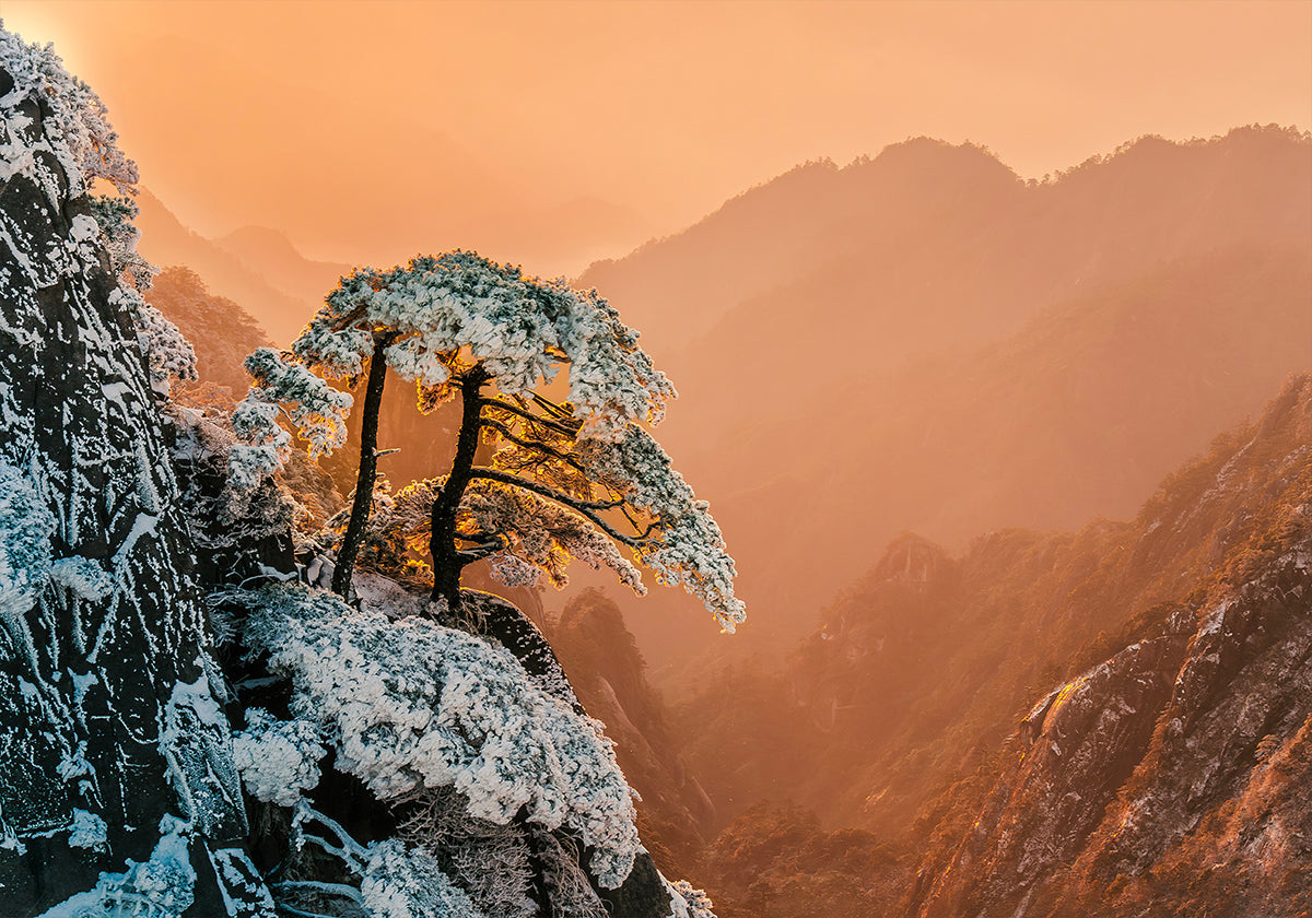 Resilience on the Edge van Wei (David) Dai legt een winters berglandschap vast bij het eerste daglicht: met sneeuw bedekte sparren klampen zich vast aan een steile klifrand terwijl de rustige gloed van de zon de horizon doorbreekt. Een beeld van kracht en kalmte, waar kou, hoogte en hoop elkaar ontmoeten in een poëtische zonsopgang. Perfect om te dromen naar nieuwe pieken.