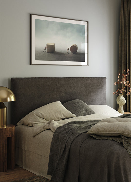 Een surrealistisch kunstwerk dat tot nadenken stemt en twee kleine figuurtjes afbeeldt die verschillende vormen – een kubus en een cilinder – voortduwen. Ze symboliseren inspanning, strategie en innovatie. Deze inspirerende afbeelding staat voor probleemoplossing, vooruitgang en de vele wegen naar succes. Perfect voor moderne kantooromgevingen, creatieve studio's of inspirerende ruimtes.