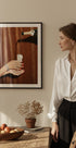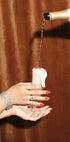 Een glamoureuze stillevenfoto waarop champagne in een glas wordt gegoten. De elegante sieraden, rode nagels en feestelijke details creëren een gevoel van feest, luxe en vreugde - perfect voor op feestjes geïnspireerde kunst aan de muur.