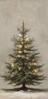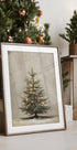 Een zacht geschilderde kerstboom in vintage-stijl staat in rustig winterlicht met kleine gouden lichtjes tussen de diepgroene takken. De neutrale, gestructureerde achtergrond en een vleugje sneeuw geven het motief een rustige en nostalgische kerstsfeer – perfect voor gezellige seizoensdecoraties, klassieke galerijwanden of Scandinavische huizen.