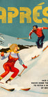 Een nostalgische après-ski pinup scene: een lachend stel in vintage stijl dat whisky roostert, omringd door met sneeuw bedekte bergen en een retro chaletsfeer. Warme amberkleuren ontmoeten de kristalheldere winterlucht, en details zoals skistokken, handschoenen en breisels zetten de toon. Perfect voor de barwand, de cabine of winterdromen het hele jaar door.