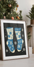 Opvallende blauwe letters steken af tegen een diepzwarte achtergrond en spellen speelse winterwoorden als 'Sokken' en 'Knitwear' in een nostalgische, retro-indeling. Het is helder, grafisch en ingetogen en kanaliseert ijzige nachten, herinneringen aan sneeuwdagen en gezellige seizoensvibes - perfect om een coole vakantiestemming naar moderne ruimtes te brengen.