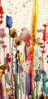 Een kleurrijk aquarelwerk met een speelse vogel omringd door abstracte bloemvormen. De kleuren druipen en vloeien over het doek, waardoor een dromerig, schilderachtig effect ontstaat. Het werk vangt de speelse schoonheid van de natuur door middel van levendige penseelstreken en krachtige tinten.