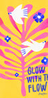 Een vrolijke en motiverende poster met twee witte duiven die vliegen tussen sterke roze bladeren en blauwe bloemen op een levendige gele achtergrond. De speelse typografie "Glow with the Flow" voegt een opbeurende boodschap van positiviteit en vreugde toe. Perfect om een goede sfeer in elke kamer te brengen.