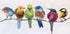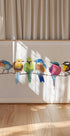 Een speels en pittoresk kunstwerk van zes kleurrijke vogels die bij elkaar op een tak zitten. Elke vogel is uniek beschilderd met opvallende strepen blauw, groen, geel, rood en bruin, waardoor een levendige en expressieve compositie ontstaat. Perfect om charme en creativiteit toe te voegen aan elke muur.