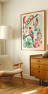 Een levendige en tropische illustratie van kleurrijke vogels die tussen weelderige takken en bloemen zitten en vliegen. Met sterke tinten groen, rood en blauw vangt het kunstwerk de vreugde en vitaliteit van de natuur in de zomer. Perfect om een fris en exotisch tintje aan elke kamer toe te voegen.