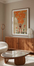 Een surrealistische digitale collage die portret, vogels en een levendige explosie van oranje bloemen combineert. Het kunstwerk combineert vintage botanische en ornithologische illustraties met modern surrealisme en symboliseert de harmonie tussen mens en natuur. Door de warme herfsttinten is het een opvallend element in zowel eclectische als moderne interieurs.