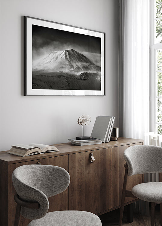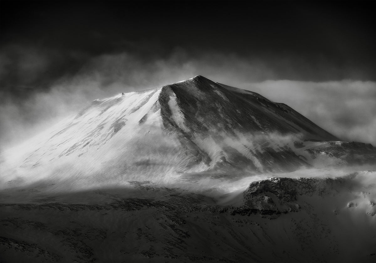 Een rauwe, winterse bergkam rijst op tegen een bleke hemel; IJsblauwe tinten en diepe schaduwen benadrukken de meedogenloze natuur. Nevels zweven langs de steile wanden en geven het onderwerp een mysterieuze rust. Forbidden van Robert Bolton legt de schoonheid van de kou vast en nodigt uit tot stille reflectie. Een krachtig, minimalistisch motief voor in huis.