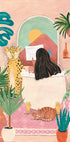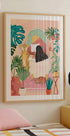 Vrouw die een bad neemt in een roze tropische badkamer Poster