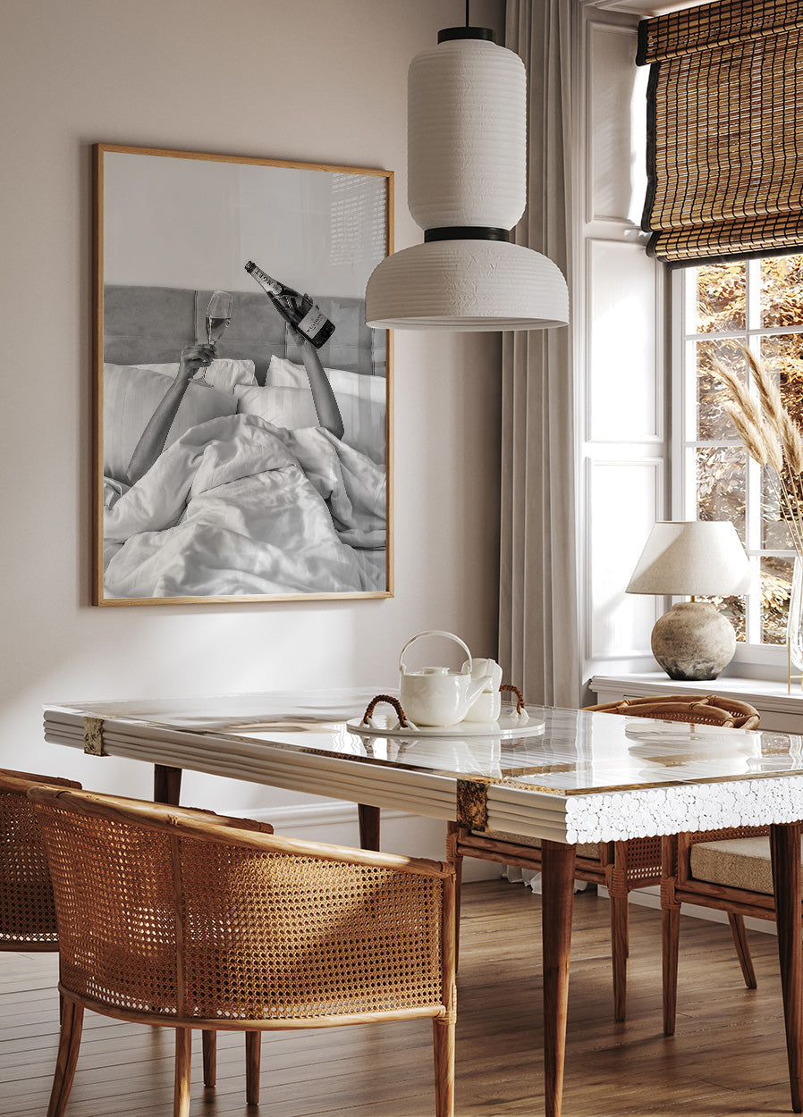 Poster van een vrouw die wijn drinkt in bed