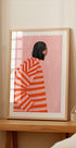 Dit kunstwerk heeft een minimalistisch ontwerp dat een vrouw in een rood-wit gestreepte outfit benadrukt tegen een zachtroze achtergrond. De moderne esthetiek en het gedurfde kleurgebruik creëren een onderscheidende visuele expressie, perfect voor liefhebbers van moderne kunst.