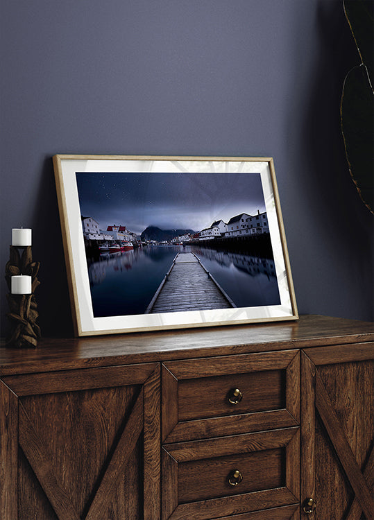 Wanneer de nacht valt over Henningsvær op de Lofoten, worden de houten huizen en vissersboten weerspiegeld in het stille water, terwijl de sterren boven de berg te zien zijn. Lior Yaakobi legt de Scandinavische rust en diepte vast met een dramatische perspectieflijn door de haven, waar het licht van de kade het oog naar de donkerblauwe lucht leidt. Een rustige nacht in het arctische licht.