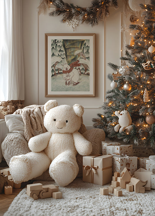 Gemaakt door Olena Kovalova: Creatures of the North verenigt een vriendelijke beer en een nieuwsgierig konijn in een besneeuwd noordelijk land. Gedempte rode, groene en blauwgroen tinten en een vleugje vintage zorgen voor een warme kerstsfeer, terwijl de rustige details uitnodigen tot aanwezigheid en gezelligheid tijdens de rustige winterdagen. Perfect voor de gezellige hoekjes van Kerstmis.