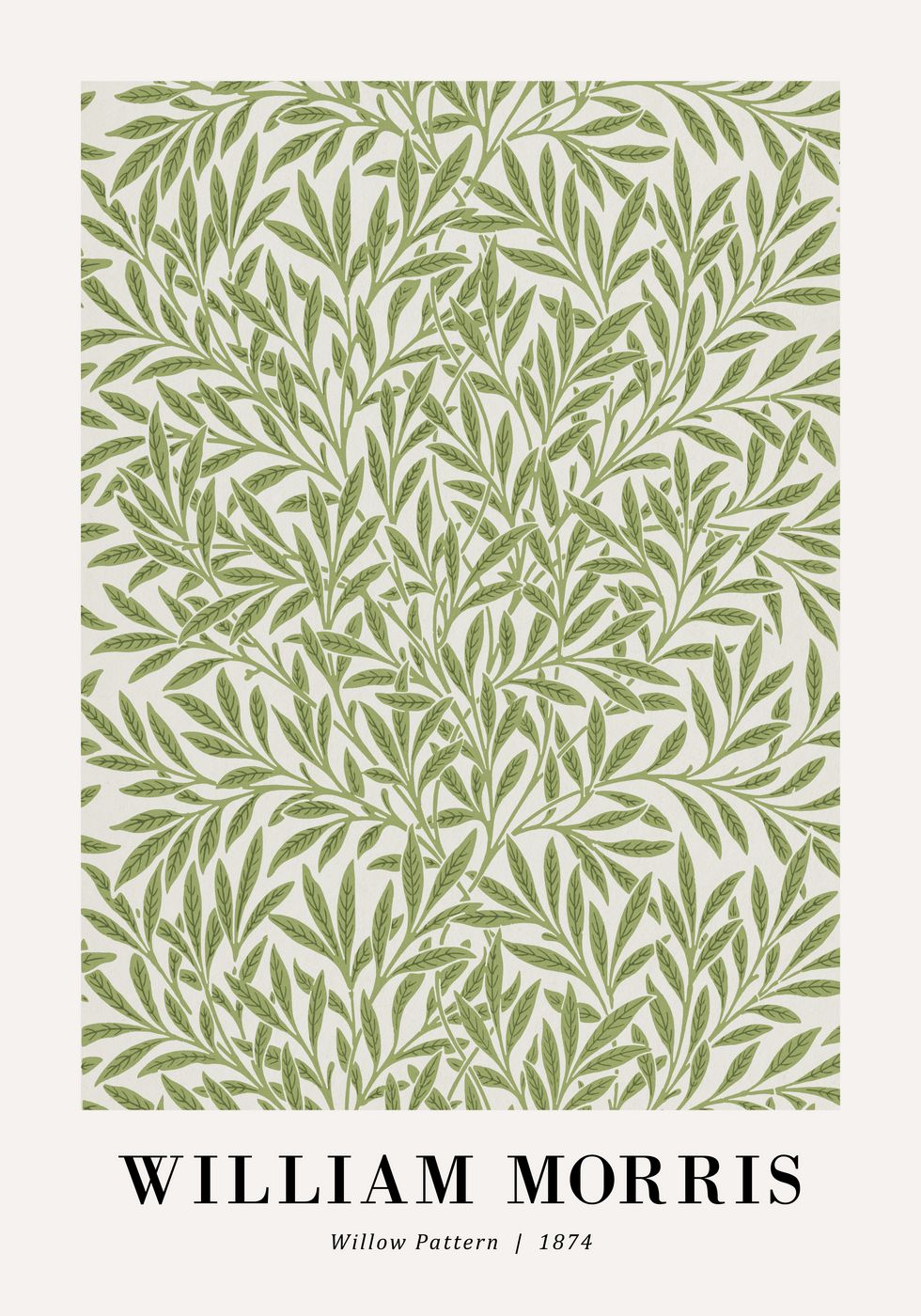 Een tijdloze botanische poster met het iconische *Wilgenpatroon*, ontworpen door William Morris in 1874. De delicate groene bladeren vormen een fascinerend, door de natuur geïnspireerd patroon dat de stijl van de *Arts and Crafts-beweging* perfect weergeeft. Ideaal voor liefhebbers van vintage design, klassiek vakmanschap en natuurlijke patronen.
