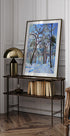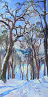 In het bos ontvouwt zich een rustige winterdag: fijnkorrelige sneeuw, donkere stammen en lage zonnestralen die door de takken breken en lange schaduwen werpen. Andrii Kutsachenko vangt de kalme en frisse kou met poëtische eenvoud – een tijdloos motief dat diepte en licht creëert in elke kamer. Perfect voor een Scandinavische inrichting.