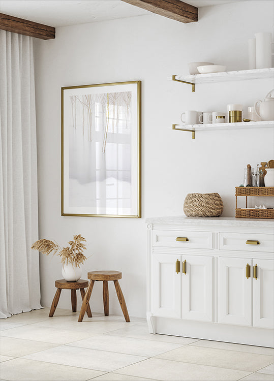 Winter Reflection van Laurentiu Pavel legt de Scandinavische winterstilte vast: kale bomen staan als grafische silhouetten langs de oevers, perfect weerspiegeld in een ijskoud water. De heldere, helder verlichte sfeer en het beperkte palet aan witte en grijstinten zorgen voor rust, harmonie en een meditatieve diepte in de kamer. Een poëtisch winterlandschap dat uitnodigt tot bezinning.