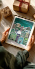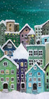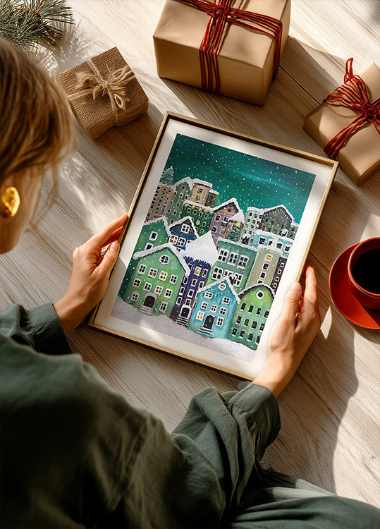 Wintertown af Monica Lindblom skildrer en sneklædt by ved nat, badet i dybe blå toner. Varme vinduer glimter mellem husrækker, en gran med lys antyder jul, og frostrøg hviler over tage og gader. En stille, poetisk byvandring, hvor urban stemning møder eventyrlig vinterro. Perfekt til at samle vinterhyggen i hjemmet.