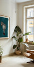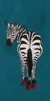 Dit moderne kunstwerk toont een zebra die tegen een blauwgroen achtergrond staat, opvallend door zijn stijlvolle zwarte schoenen met hoge hakken. De surrealistische compositie combineert wilde dieren met mode en creëert een gedurfde en speelse expressie die de traditionele dierenkunst uitdaagt.