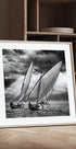Een dramatisch, monochroom zeiltafereel: een vloot van strakke zeilboten snijdt door de zee, terwijl zonnestralen door zware wolken heen breken en over de golven glinsteren. De kalme kracht en het ritme van de regatta vangen het gevoel van vrijheid op – gecreëerd door fotograaf Angel Villalba. Een tijdloos motief voor maritieme woningen en moderne muren.