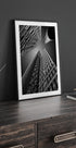 Een monochroom stadsbeeld uit Amsterdam met dramatische perspectieven, waar slanke torens en masten naar de hemel schieten. De grafische lijnen en scherpe contrasten creëren ritme en rust terwijl het zomerlicht de gevels trekt. Een moderne, stedelijke sfeer weergegeven door kunstenaar willem. Perfect voor liefhebbers van architectuur en het stadsleven.