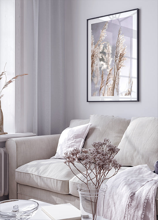 Een rustgevend natuurtafereel met fijne rietjes die het licht van de zonsondergang vangen. De neutrale kleuren en zachte contrasten creëren een ontspannen en luchtige sfeer in elke kamer.