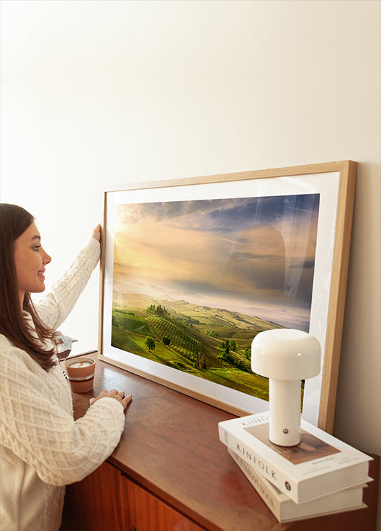 Podere Belvedere's Sunrise van Arnaud BRATKOVIC - Premium kwaliteitspapier met een glad, mat oppervlak en een elegante uitstraling. De matte afwerking vermindert schittering en geeft een verfijnde, tijdloze uitstraling. Sterk en duurzaam voor langdurig gebruik, ideaal voor zowel professionele omgevingen als decoratieve displays.