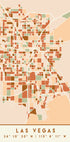 Een suggestieve kaart van Las Vegas, geïnterpreteerd door Emiliano Deificus: een strak geweven stratennetwerk en karakteristieke boulevards getekend in diepzwarte lijnen tegen warme aardetinten. De kleuren van de woestijn komen overeen met de precieze geometrie van de stad, en kleine details zoals rivieren, buurten en coördinaten creëren een elegante, moderne uitstraling. Contrasten en texturen benadrukken het ritme van de stad.