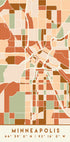Black Maps Earth Tones 55 van Emiliano Deificus distilleert Minneapolis tot een somber cartografisch kunstwerk: een dicht weefsel van straten, blokken en riviercontouren in inktzwart en warme okers. Breedte- en lengtegraad fluisteren door het raster en voegen stadstextuur samen met abstracte geometrie voor een verfijnde stedelijke sfeer.